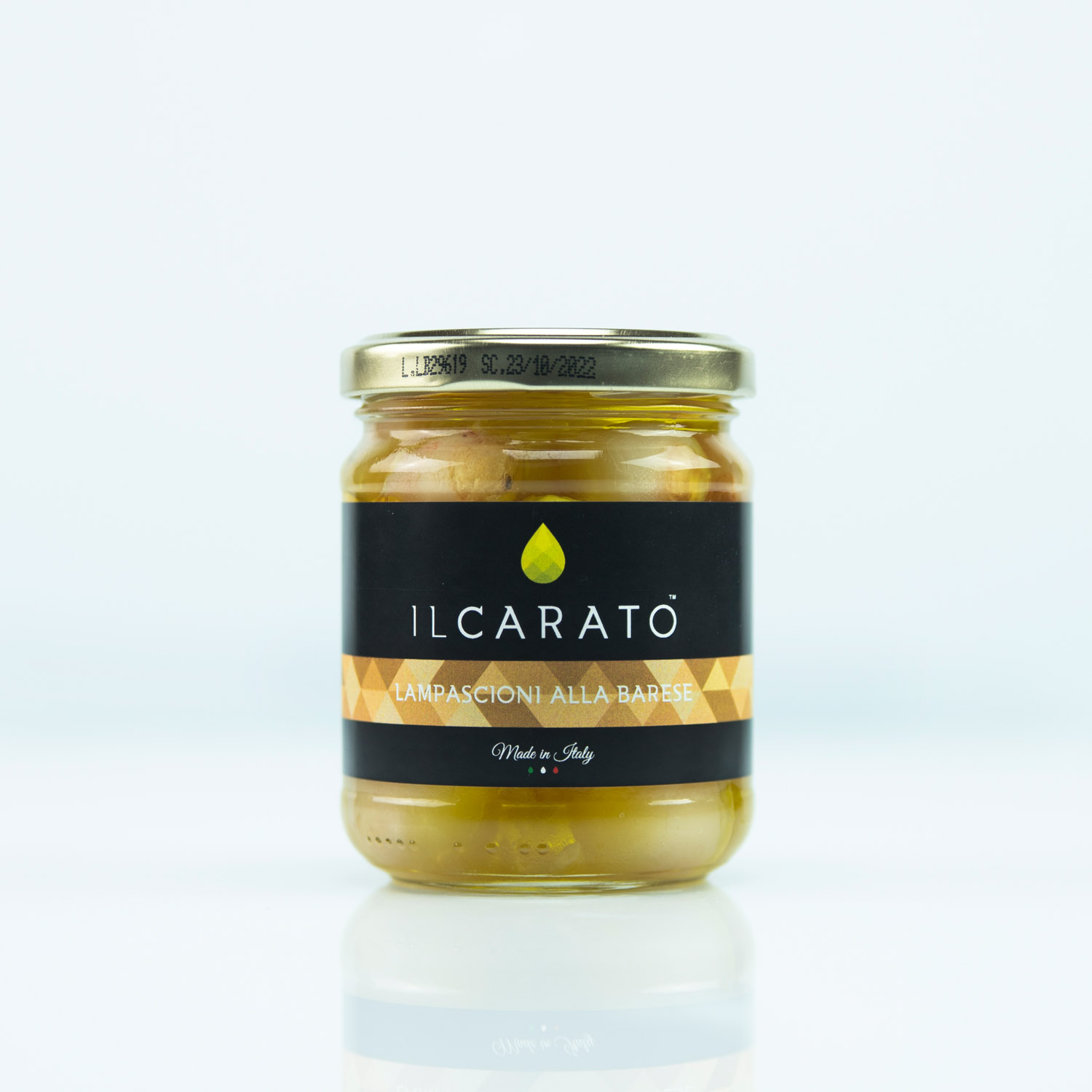 Lampascioni (Muscari comosum) 67%, olio di semi di girasole, olio extra vergine di oliva, aceto di vino, sale, aroma di alloro, correttore di acidità: acido citrico, antiossidante: acido ascorbico.
